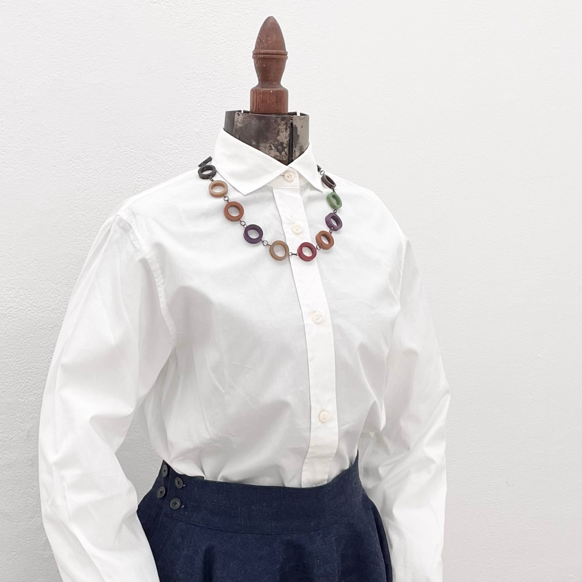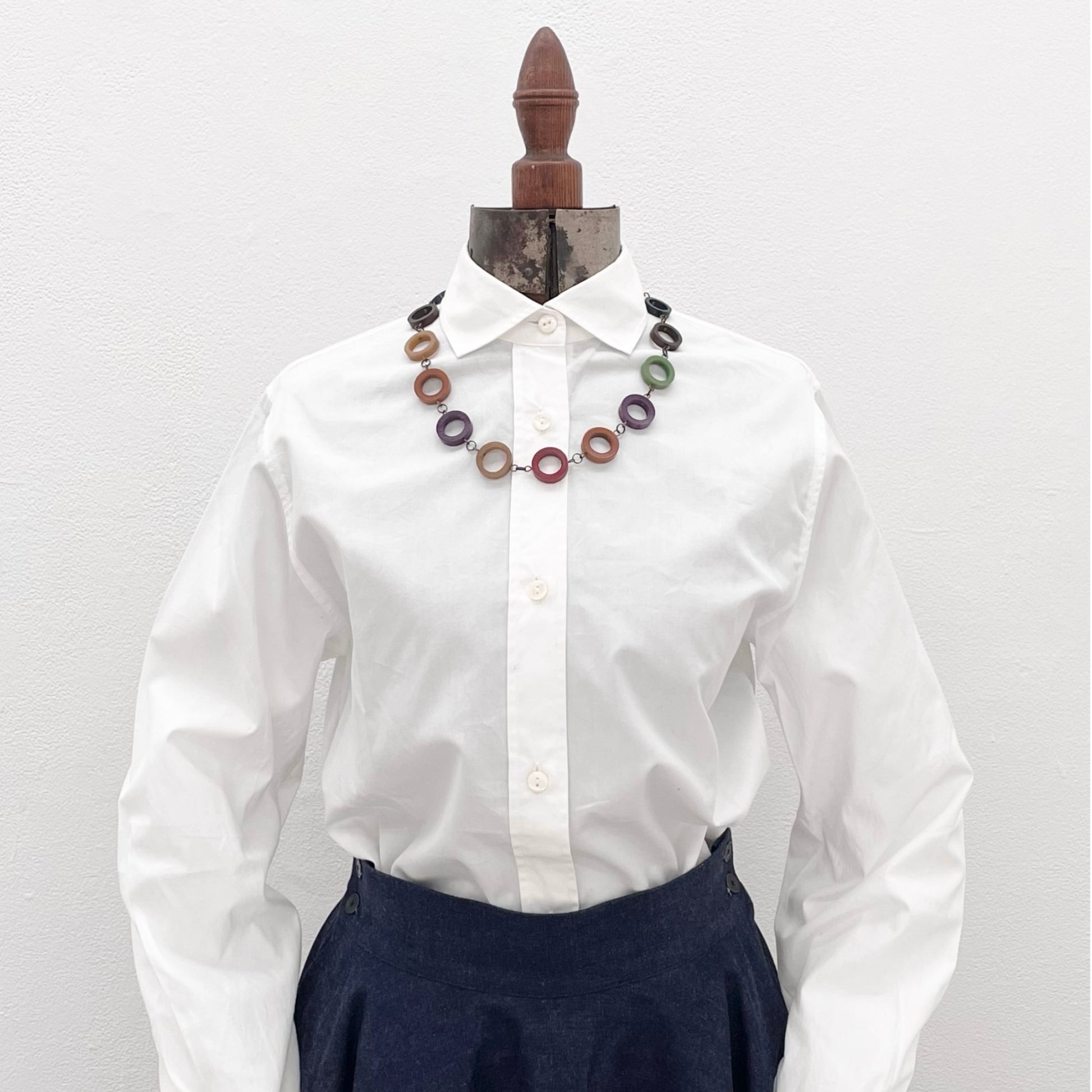 一条结合了五颜六色的戒指和金属的项链,例如紫色,绿色和米色。